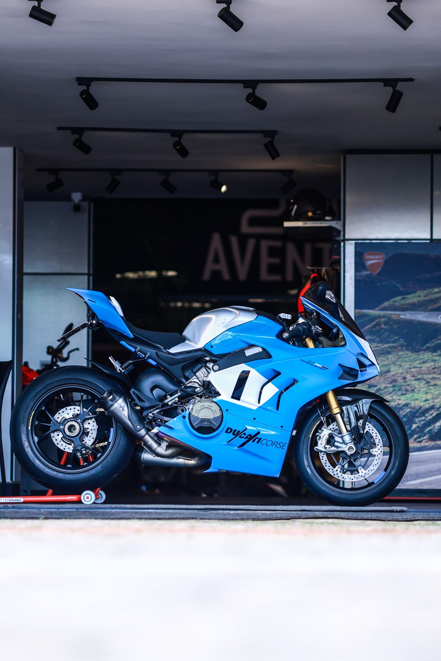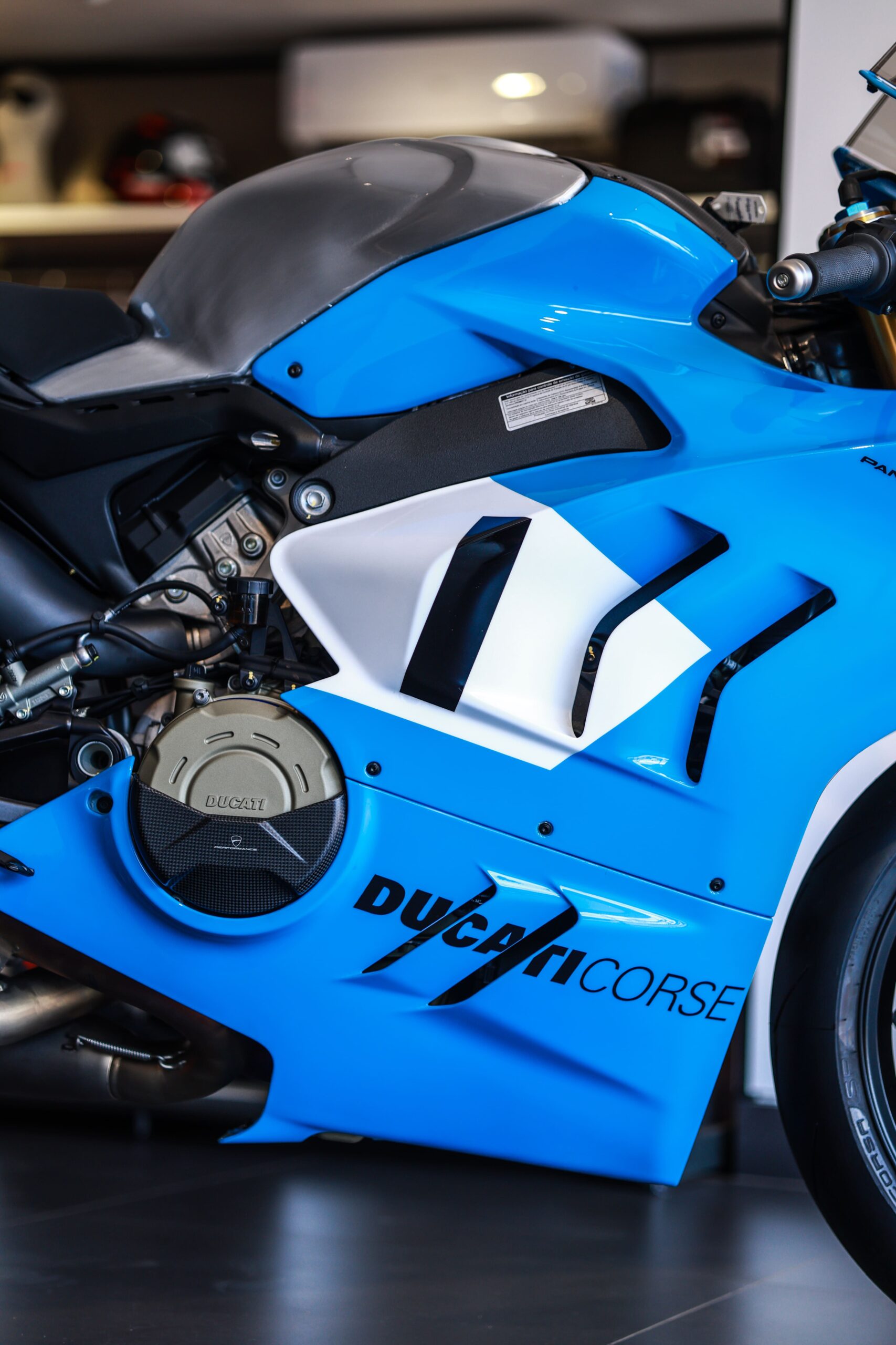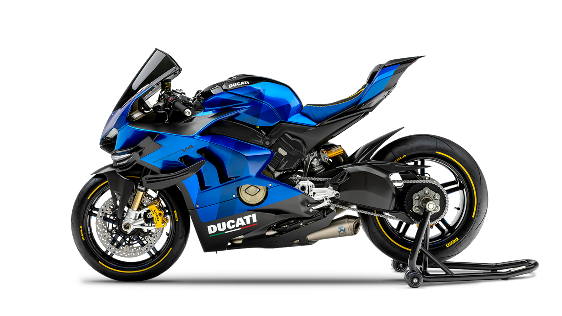 A Panigale V4 S Azul foi transformada para destacar o equilíbrio perfeito entre beleza e potência. Um projeto exclusivo, com um acabamento em azul metálico brilhante que realça ainda mais a agressividade da moto.