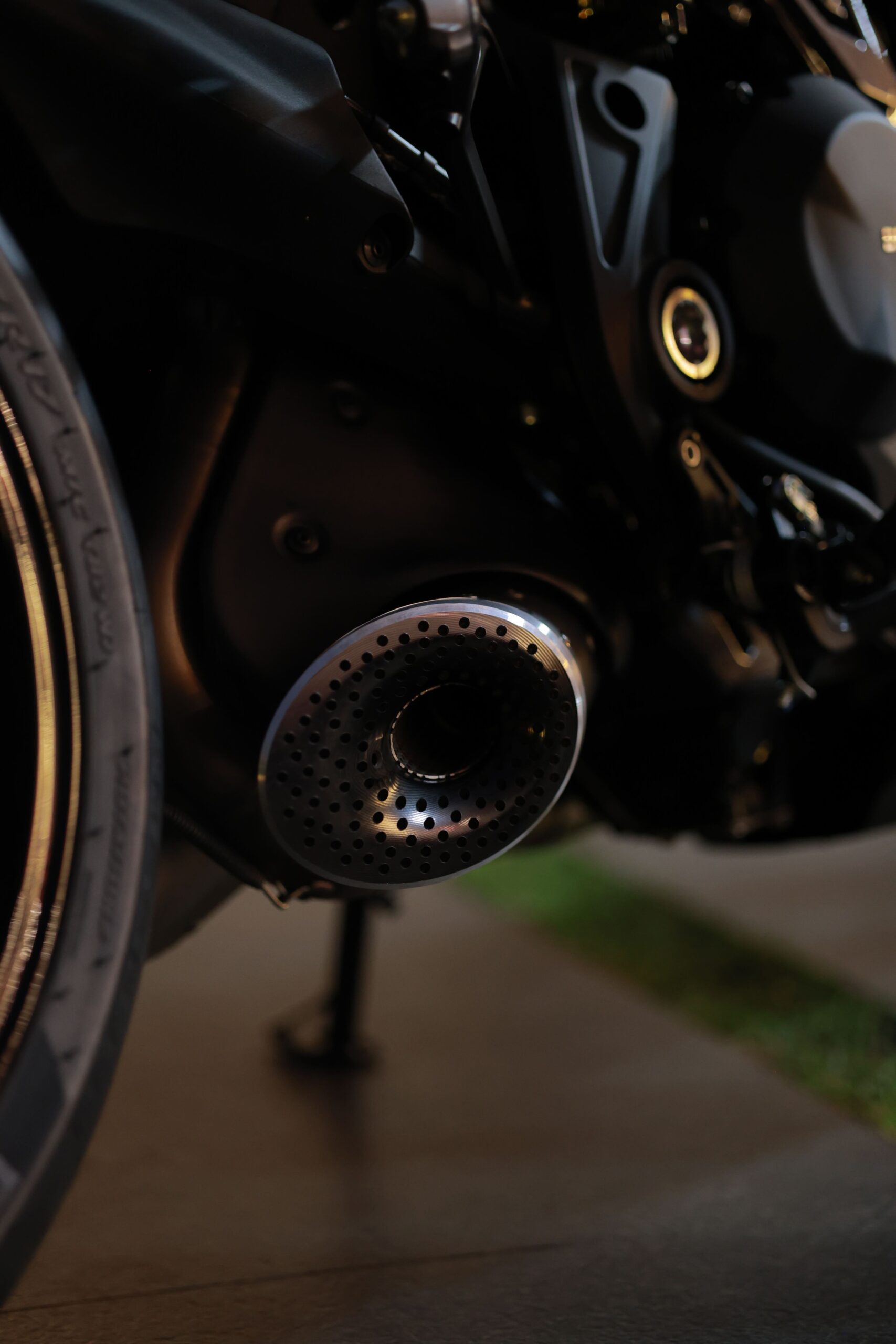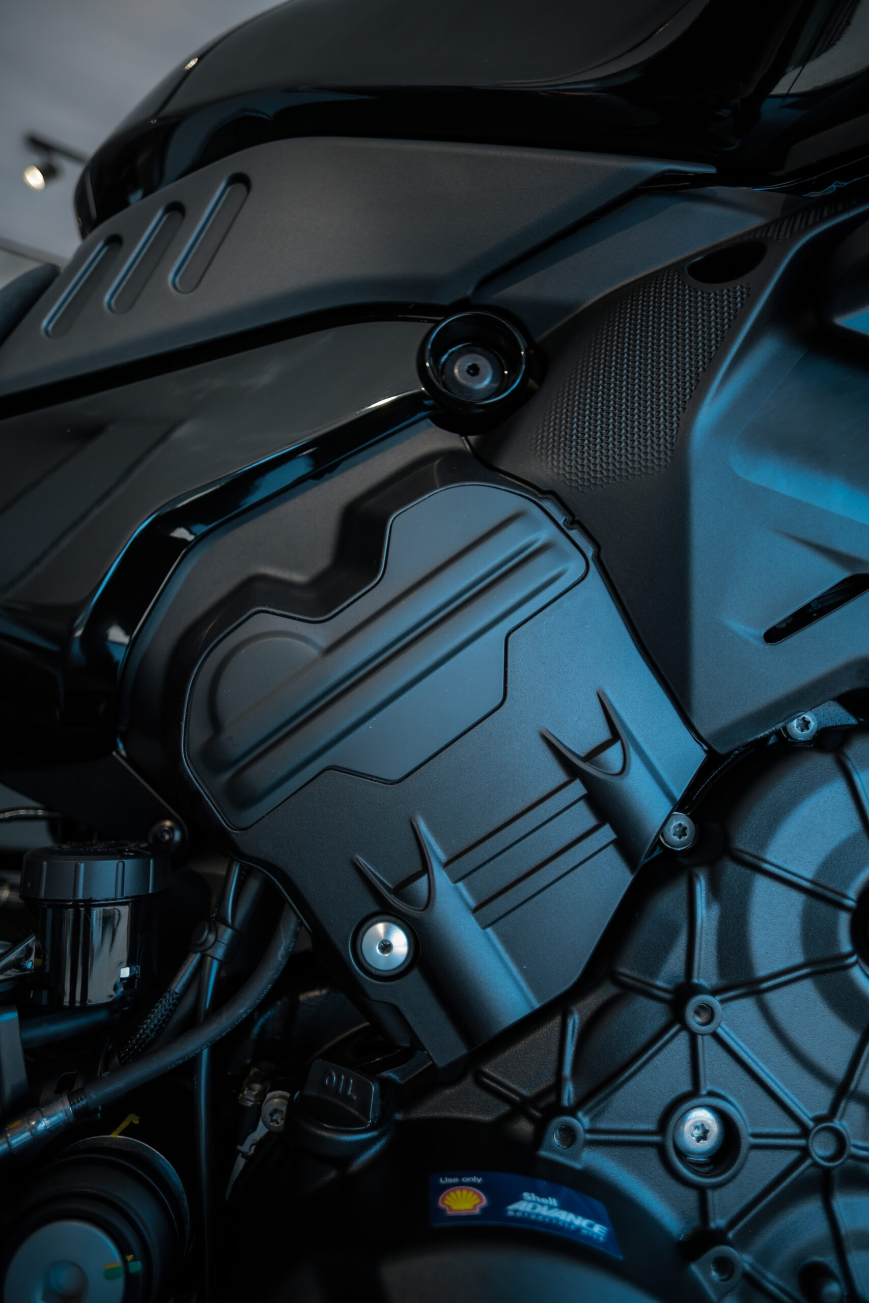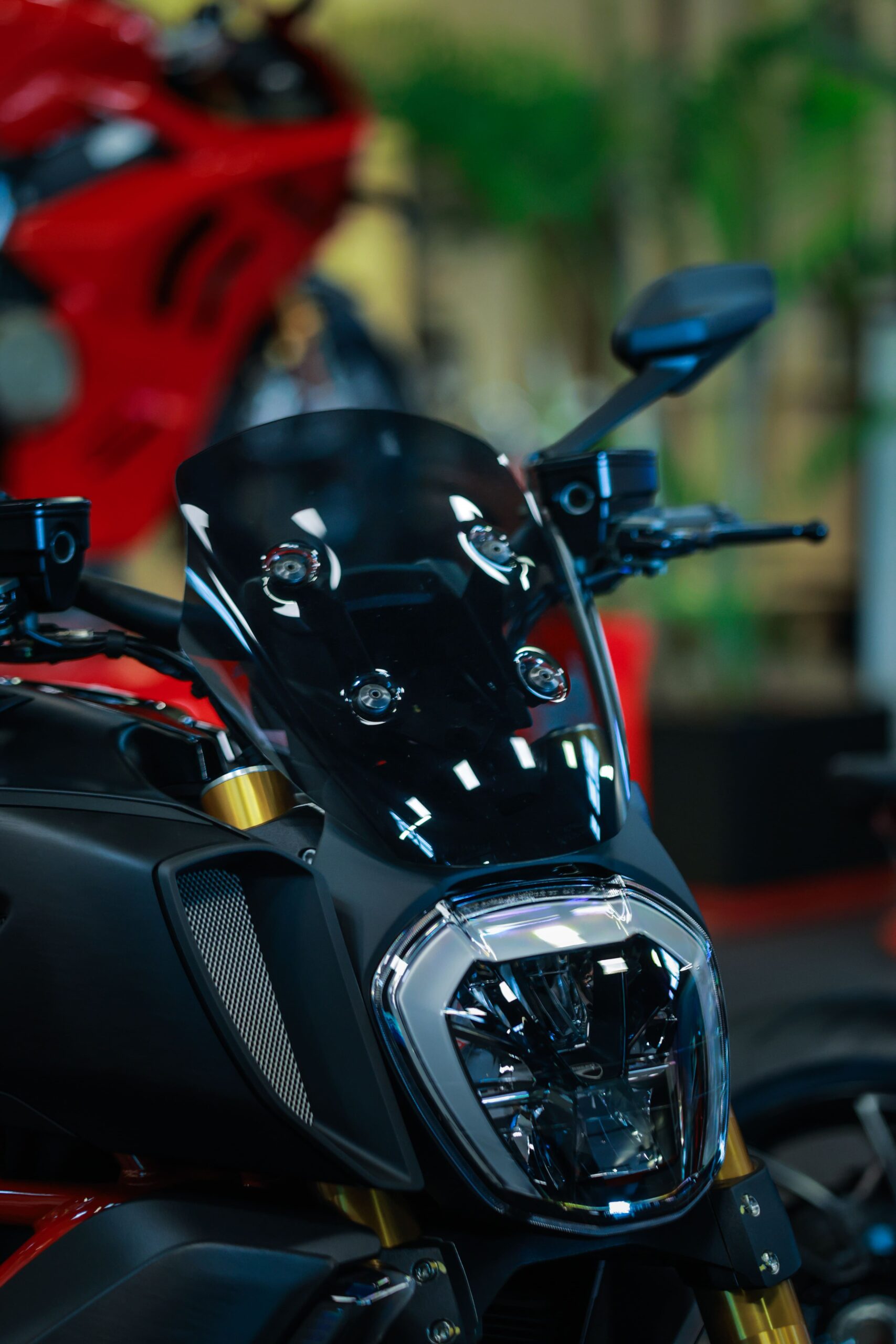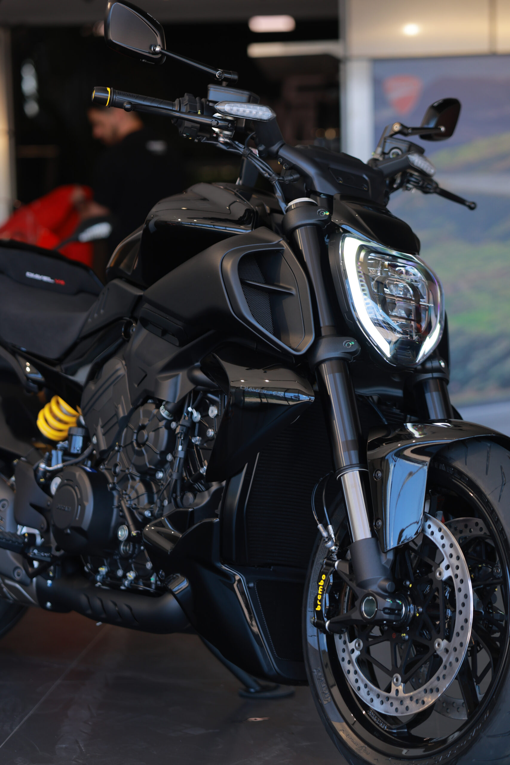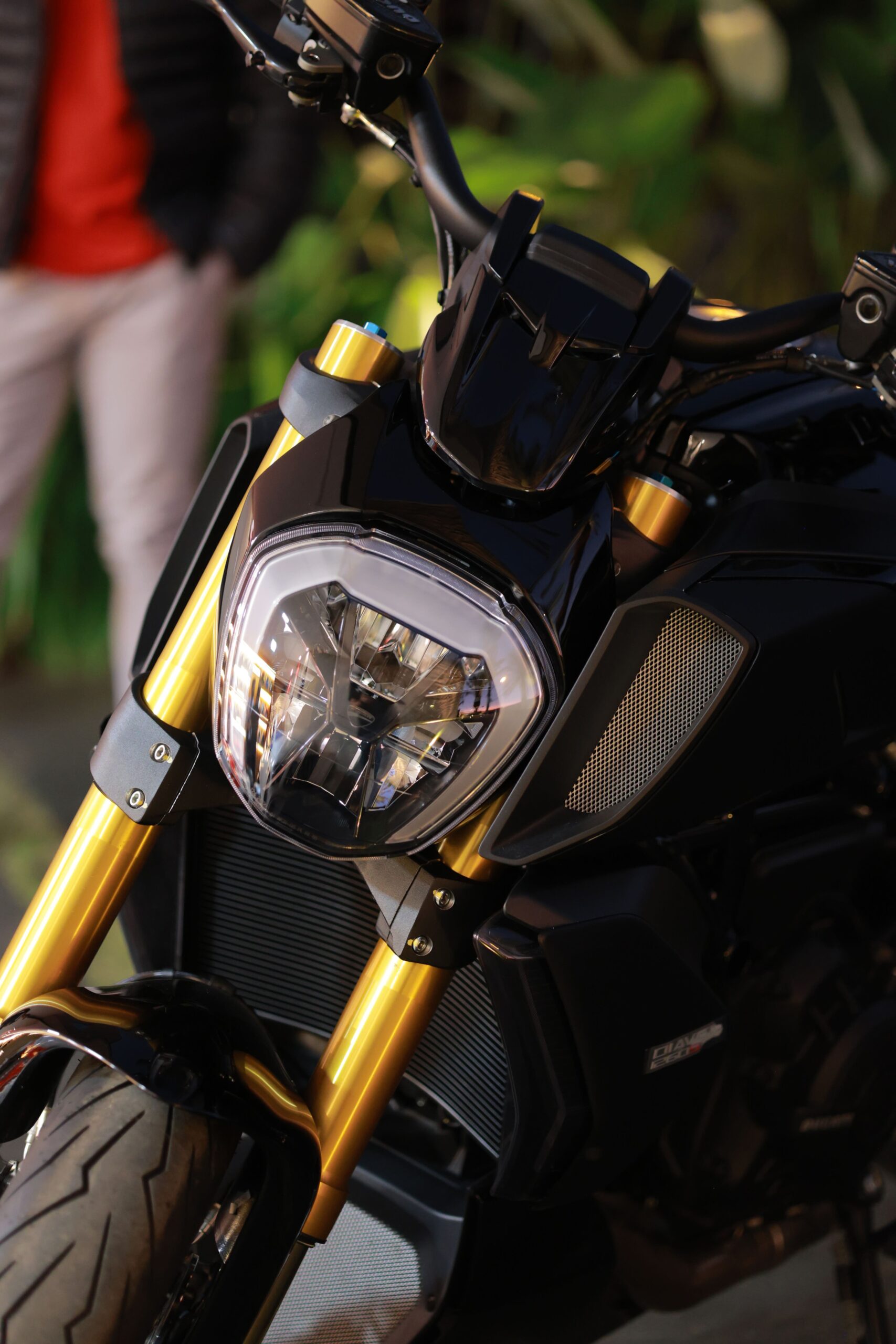 A Diavel V4 All Black é uma verdadeira obra de arte, com um visual imponente, totalmente preto, que exala potência e elegância. Os detalhes em dourado, como as peças Brembo e o peso de guidão, trazem sofisticação e exclusividade, enquanto o restante da moto, com acabamentos brilhantes e foscos, complementa perfeitamente essa máquina de performance. Cada detalhe foi pensado para criar uma moto única, imbatível tanto no visual quanto no desempenho.