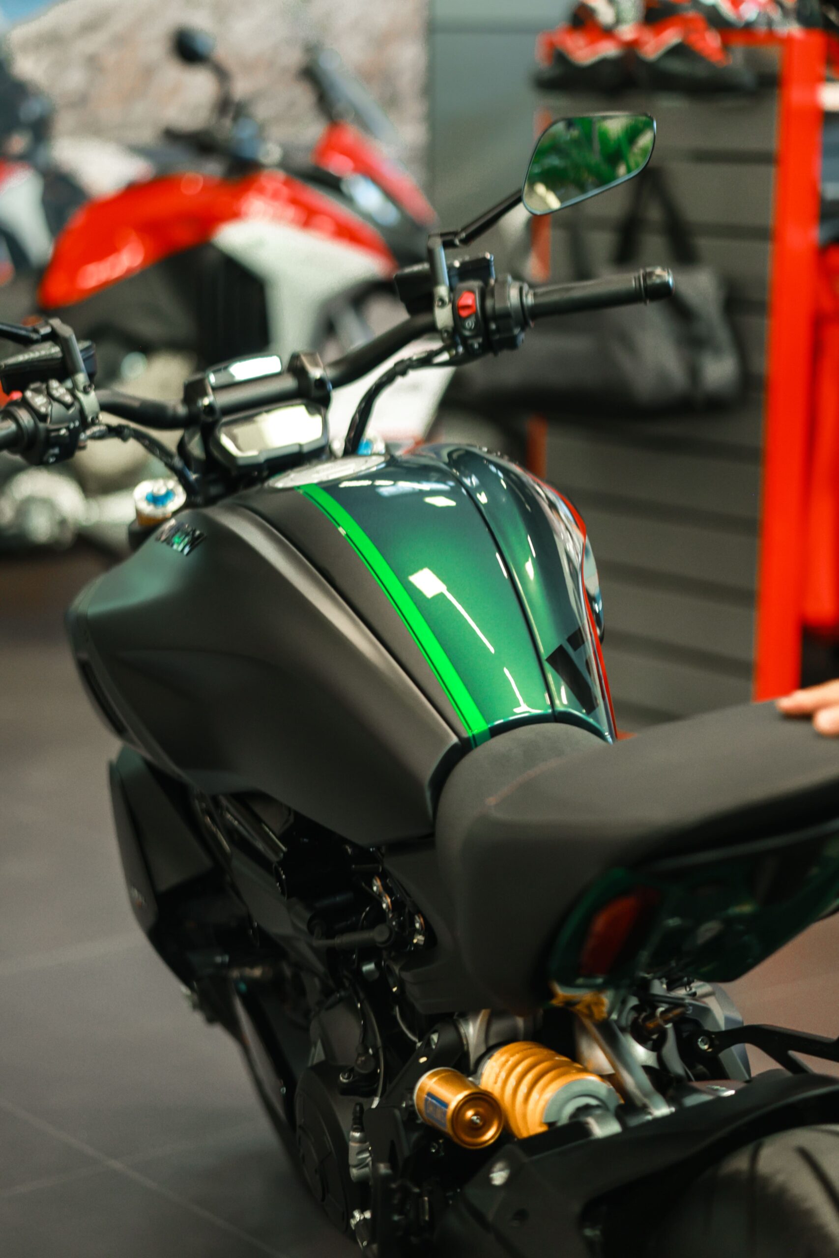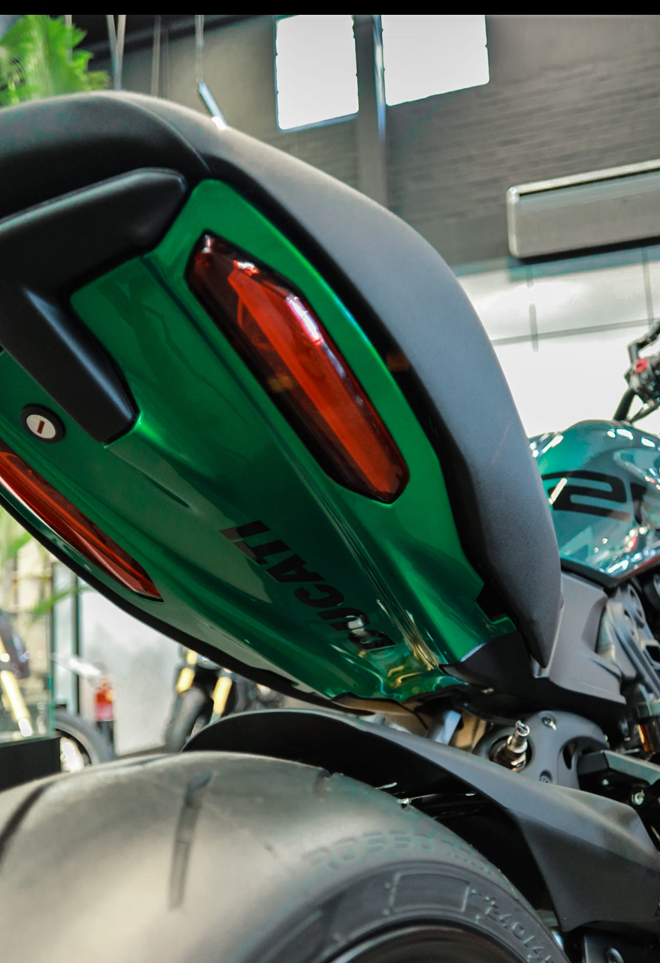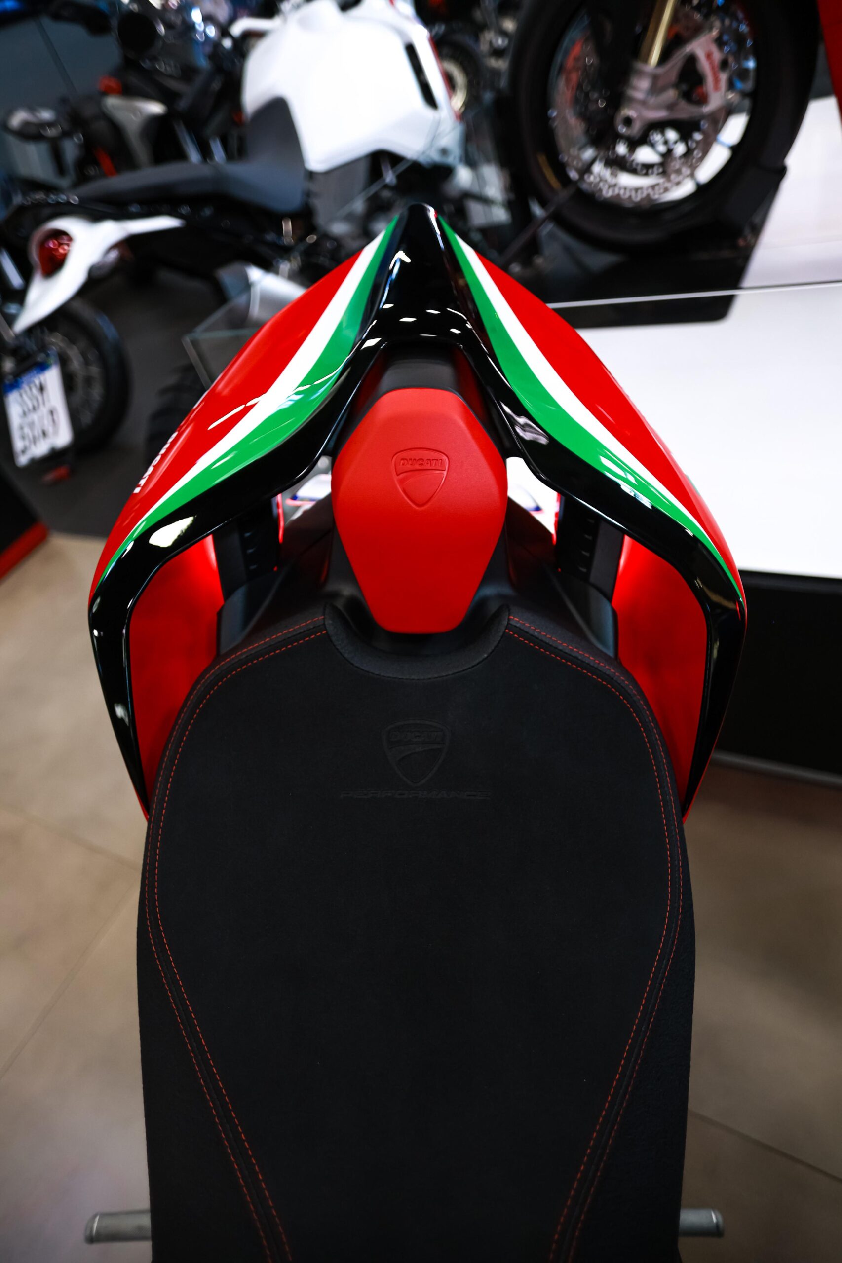 A Panigale V4 S Tricolore traz as cores da Itália com orgulho. A customização em verde, branco e vermelho é um tributo à paixão e à tradição da Ducati.
