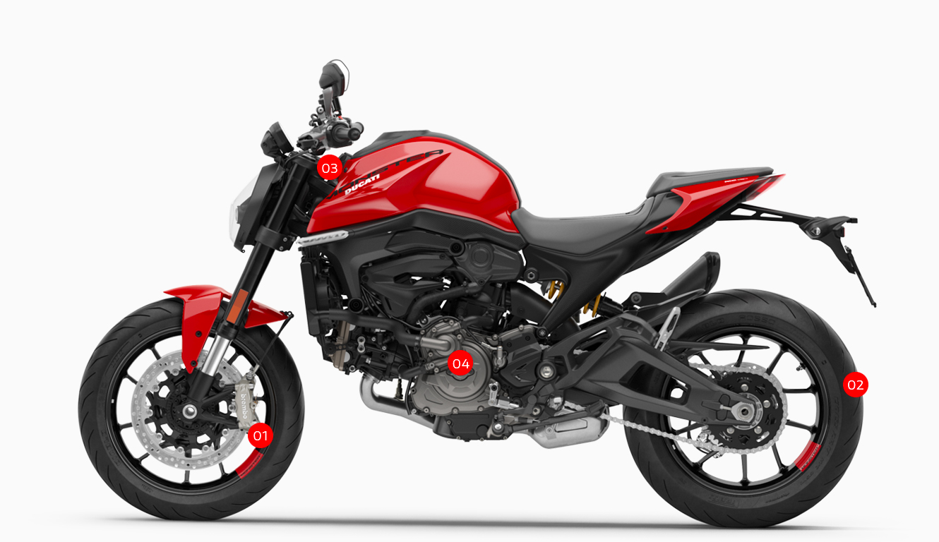 Até as rodas de liga leve, reduzidas a apenas 1,7 kg em comparação com os modelos Monster 821, participam da nova leveza geral da Monster. 3,5 x 17″ na frente e 5,5 x 17″ na traseira, montando pneus Pirelli Diablo Rosso III, 120/70 na frente e 180/55 na traseira. Uma escolha especial para apoiar a esportividade do Monster, tanto em superfícies secas quanto molhadas.