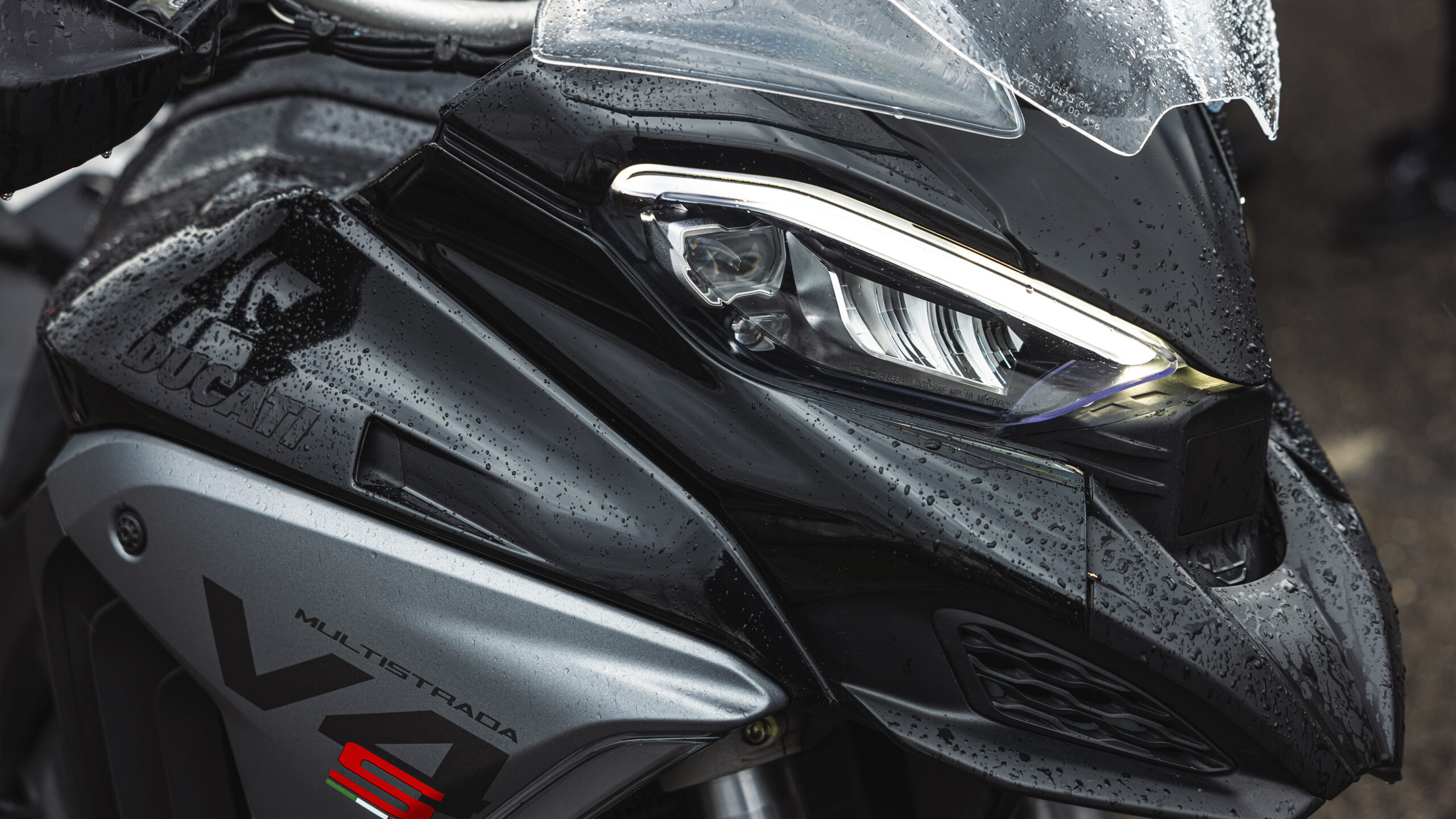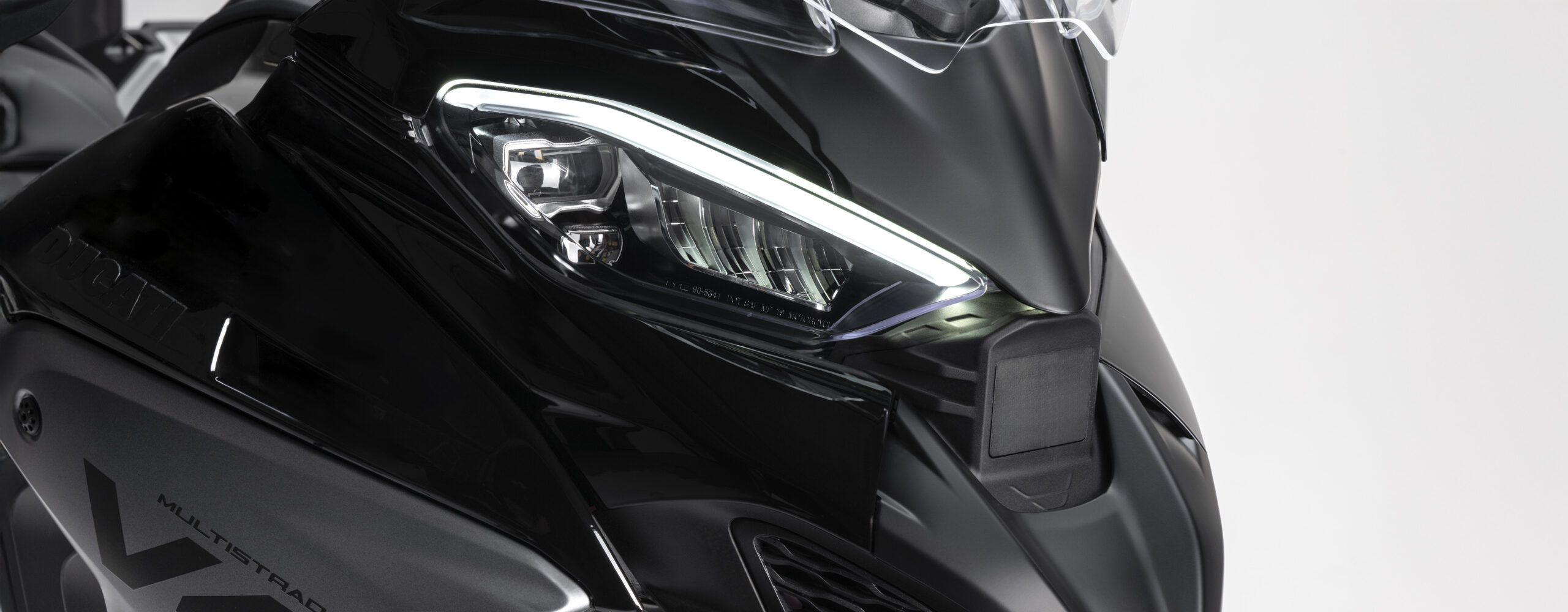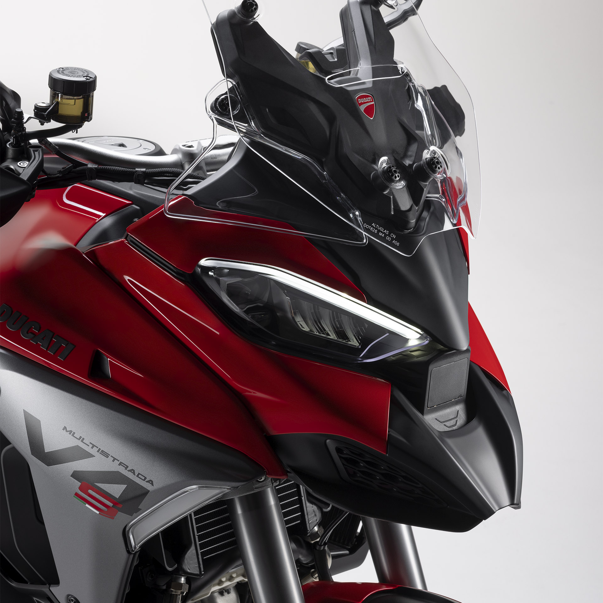 O design frontal da Multistrada V4 otimiza a proteção aerodinâmica, reduzindo ao mínimo a exposição do piloto e do passageiro ao vento. As linhas mais agressivas conferem à moto um visual esportivo e dinâmico. O farol Full LED com Cornering Light foi atualizado para eliminar áreas de sombra perto da roda dianteira.