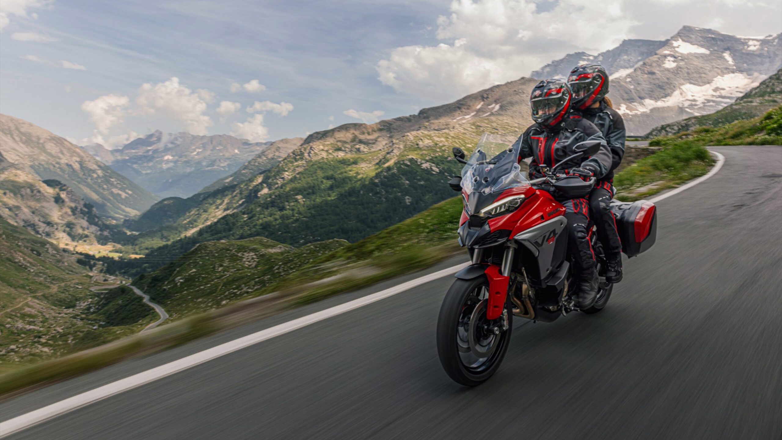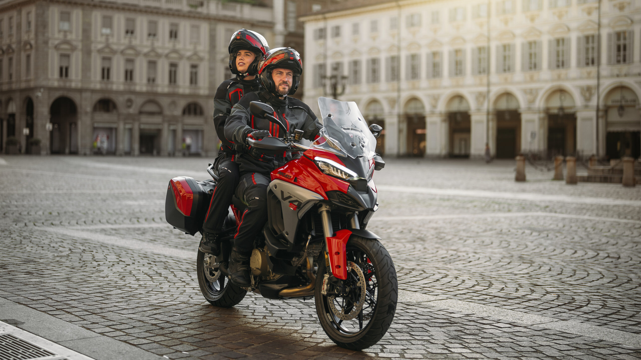 No modo Touring Riding, a Ducati Multistrada V4 libera seus 170 cv, mas a entrega é mais suave e progressiva. Níveis mais altos de intervenção DTC e DWC contribuem para um melhor controle do veículo. O ABS está definido para o nível 3, o mais seguro e prudencial graças à detecção de elevação da roda traseira, funcionalidade ABS em curvas e um efeito de frenagem combinado dianteiro/traseiro otimizado. A configuração da suspensão é projetada, na versão S, para viagens longas e oferece o máximo conforto ao piloto e ao passageiro.