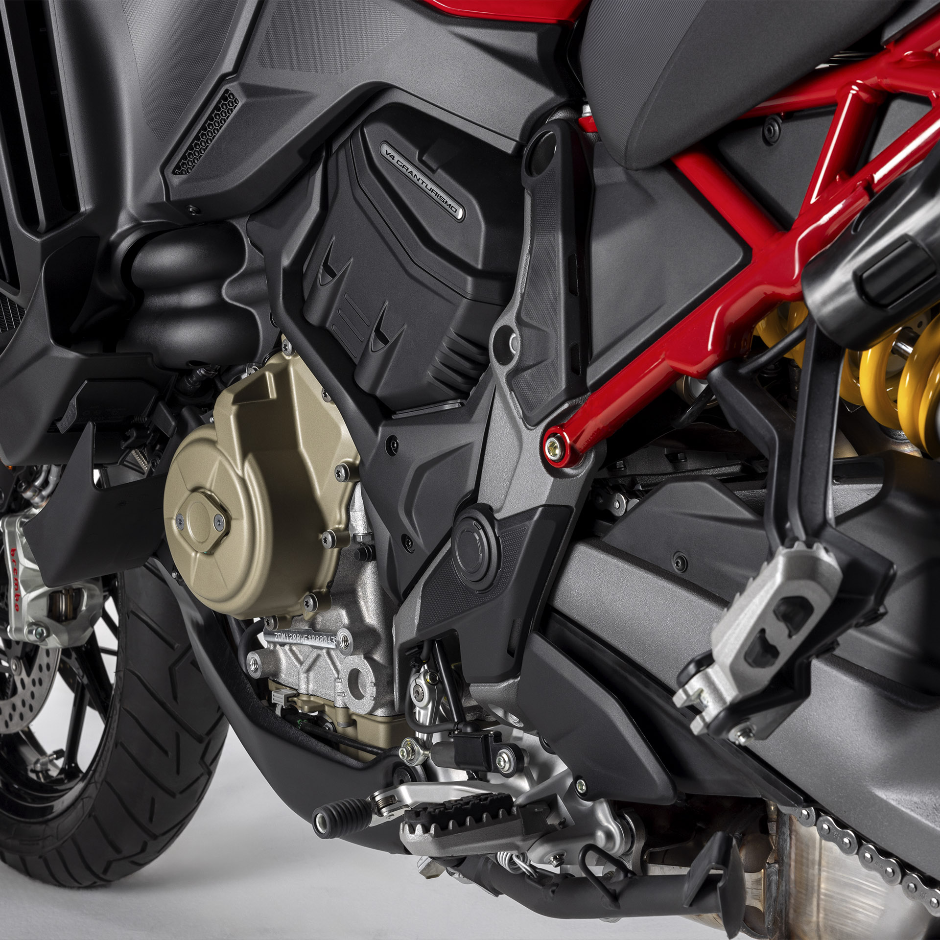 O motor V4 Granturismo da Multistrada V4 é equipado com um virabrequim contrarrotativo, tecnologia derivada da experiência da Ducati na MotoGP. Essa inovação atua “contra” a inércia giroscópica das rodas, melhorando a dirigibilidade e a precisão da pilotagem.