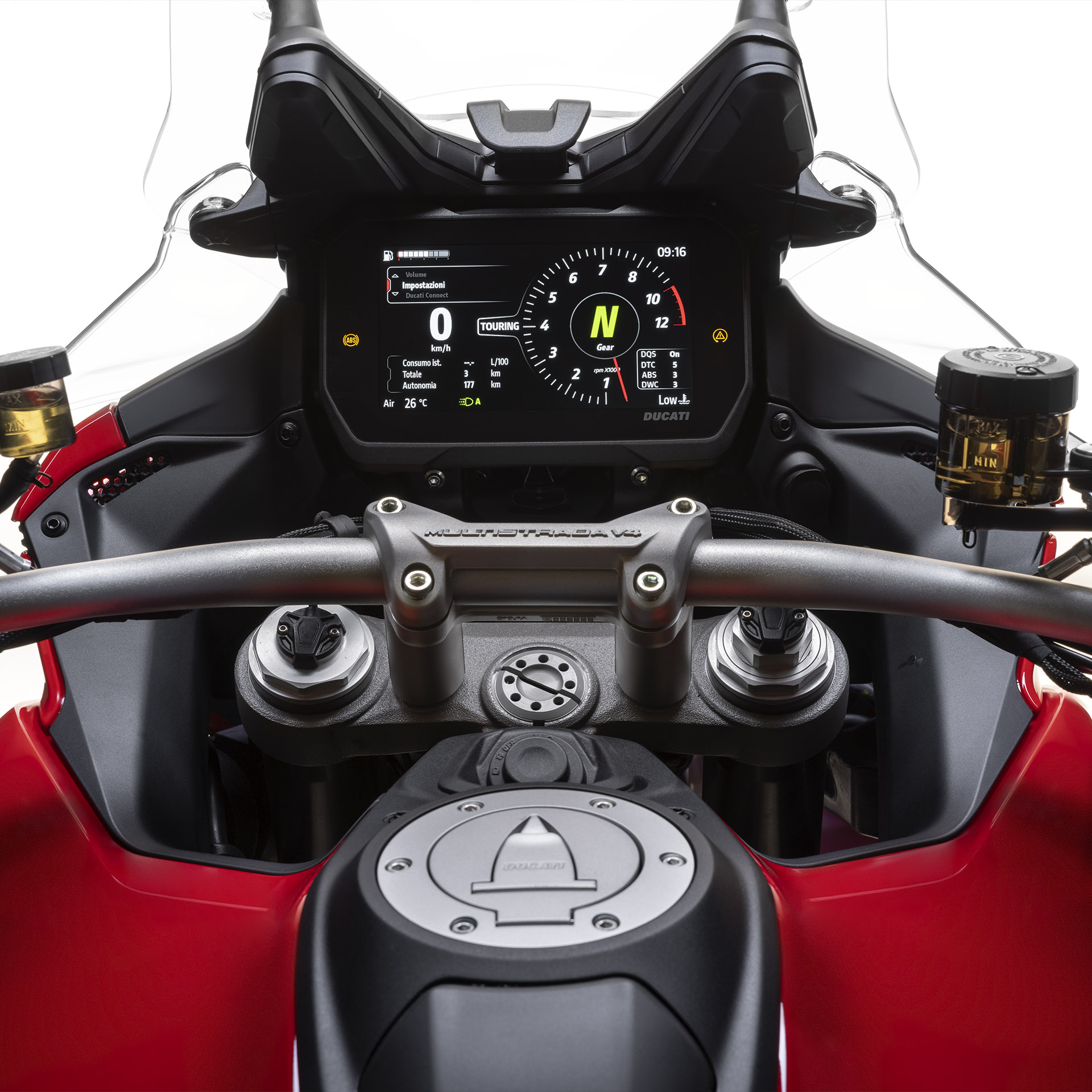 A Multistrada V4 S vem completa com um painel TFT de 6,5″ projetado para oferecer excelente legibilidade em todas as condições, graças à tecnologia de ligação óptica. Os gráficos são completos e fornecem ao piloto todas as informações necessárias.