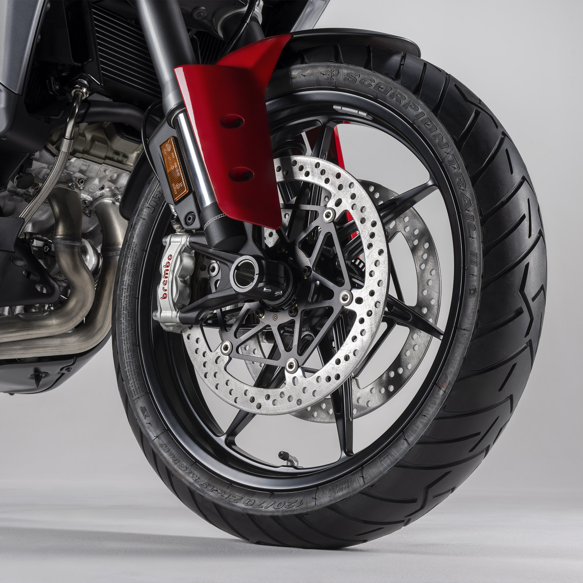 No Brasil, a Multistrada V4 S está disponível com rodas raiadas, de aros dianteiros de 19” e traseiros de 17”. A menor inércia de rotação dos aros, gera uma redução no efeito giroscópico, aumentando assim o manuseio, facilitando as mudanças de direção.